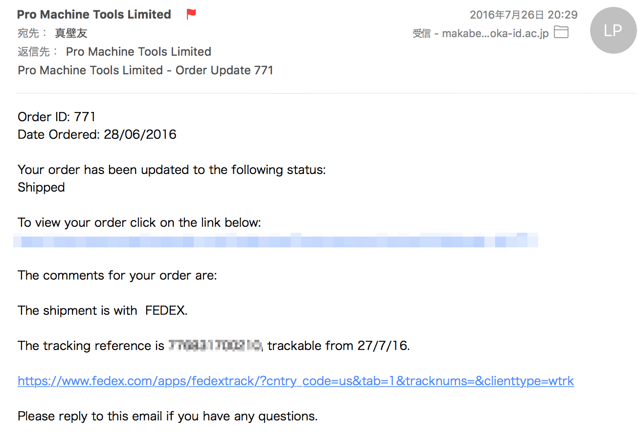 2016/7/26にFedexで送るよ、追跡番号はこちら、というメール。